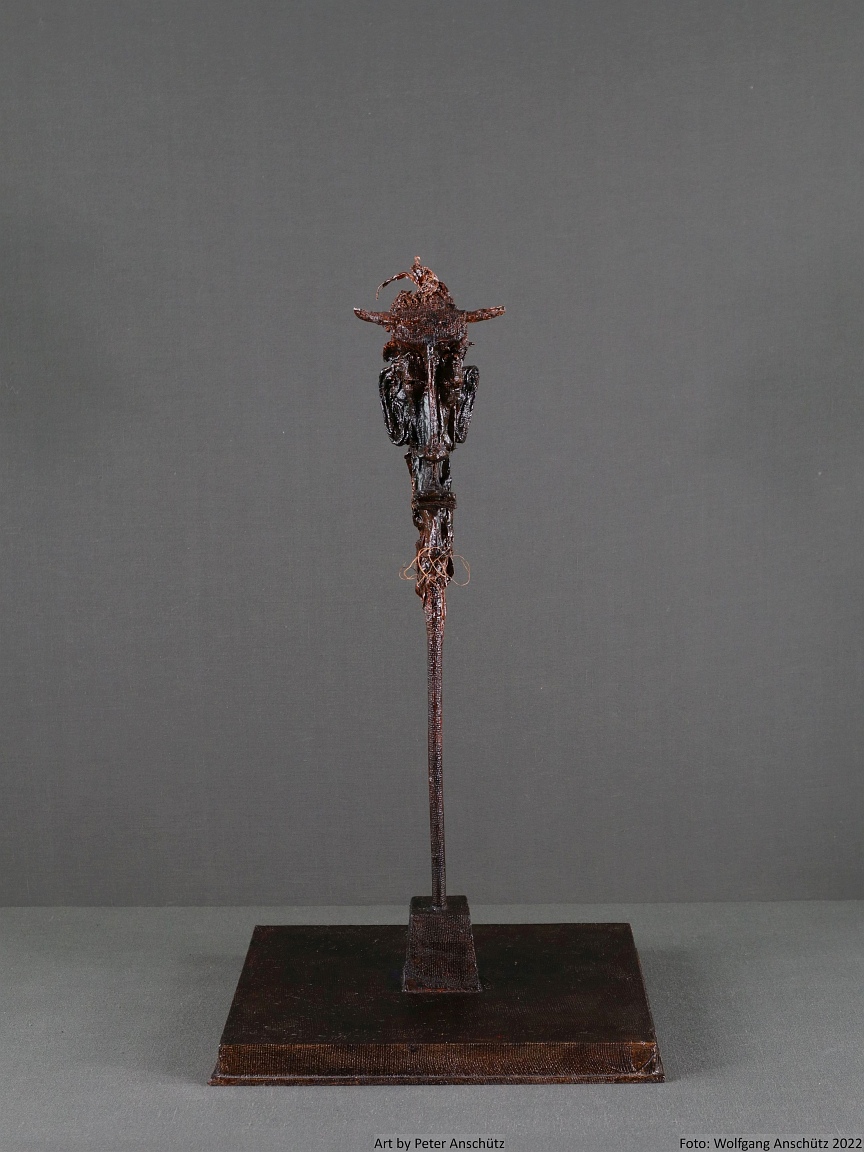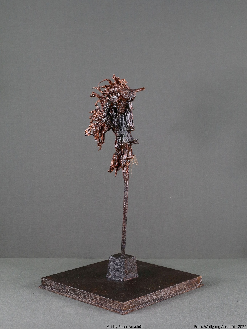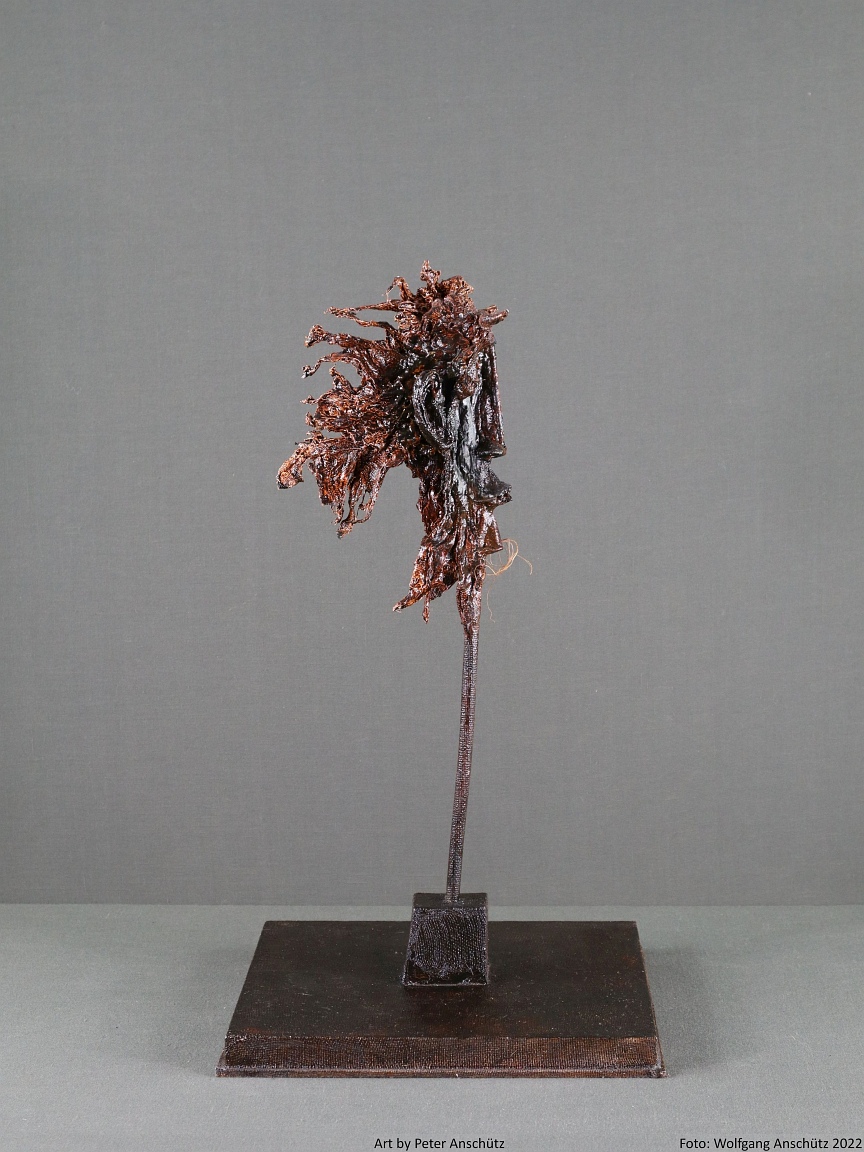 Holz, Eisendraht, Gazegewebe mit Acrylfarbe versteift
