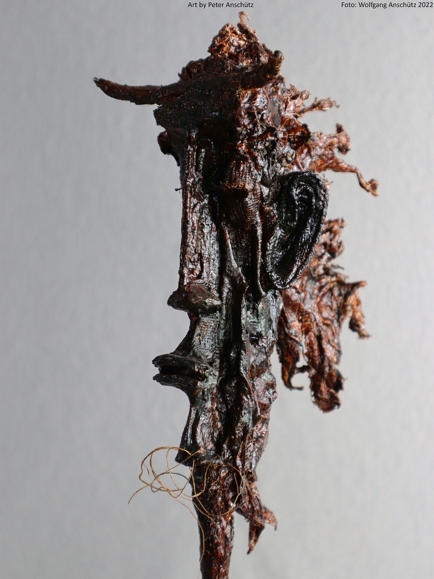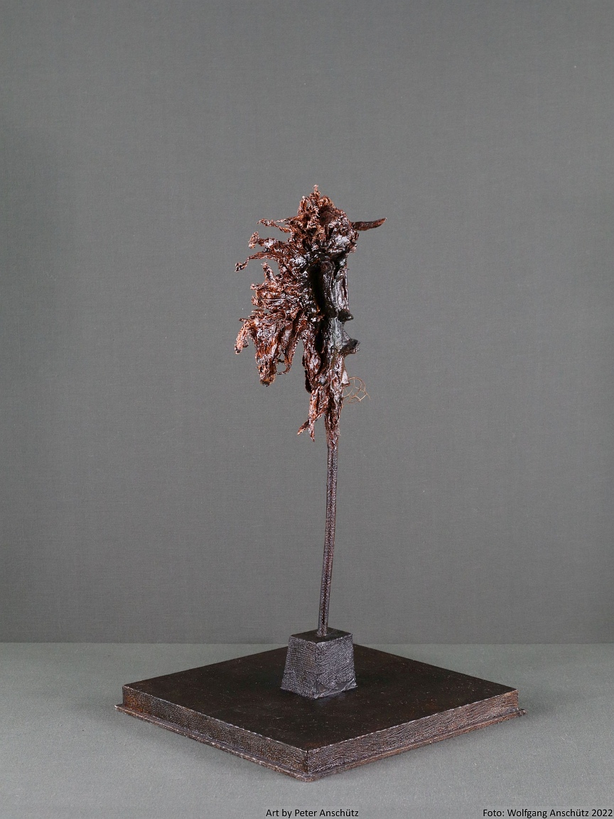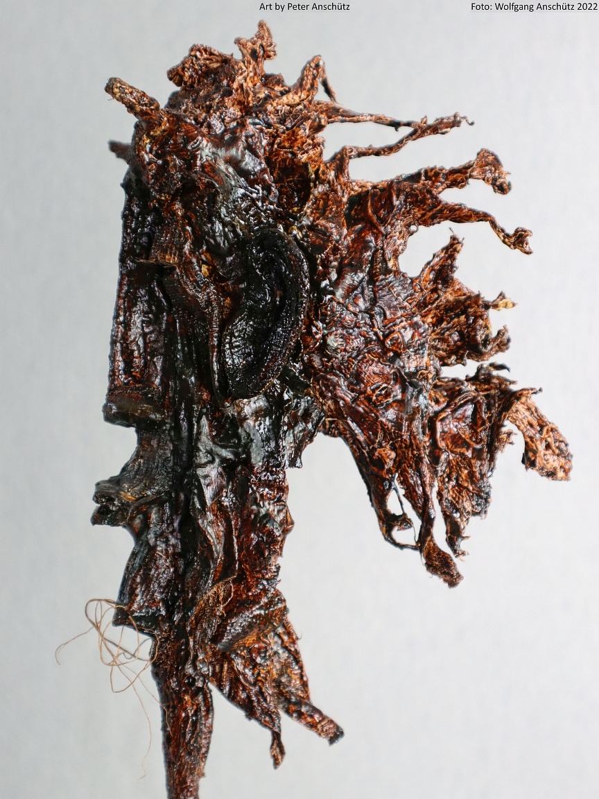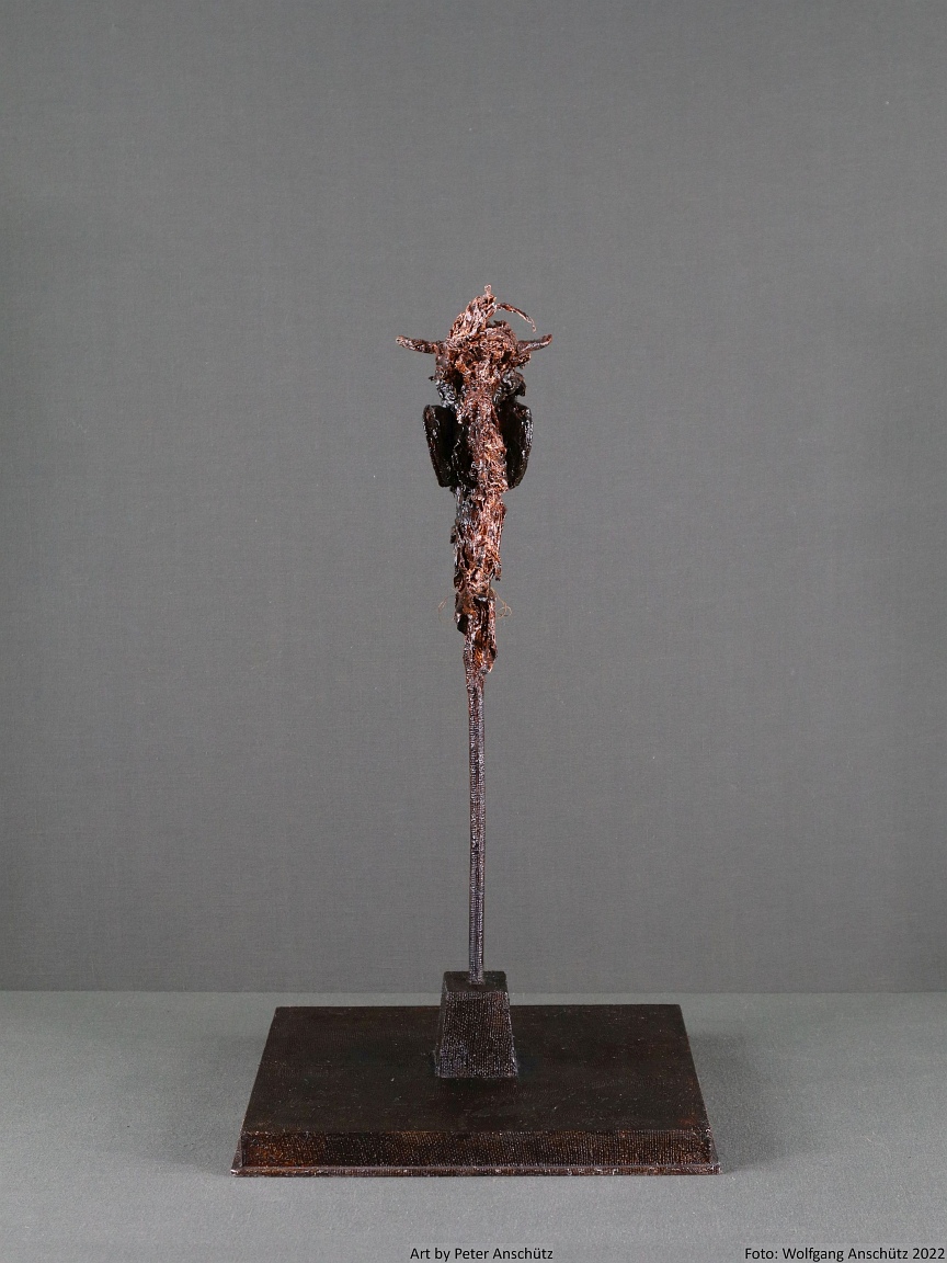 Holz, Eisendraht, Gazegewebe mit Acrylfarbe versteift