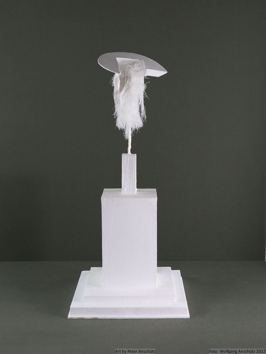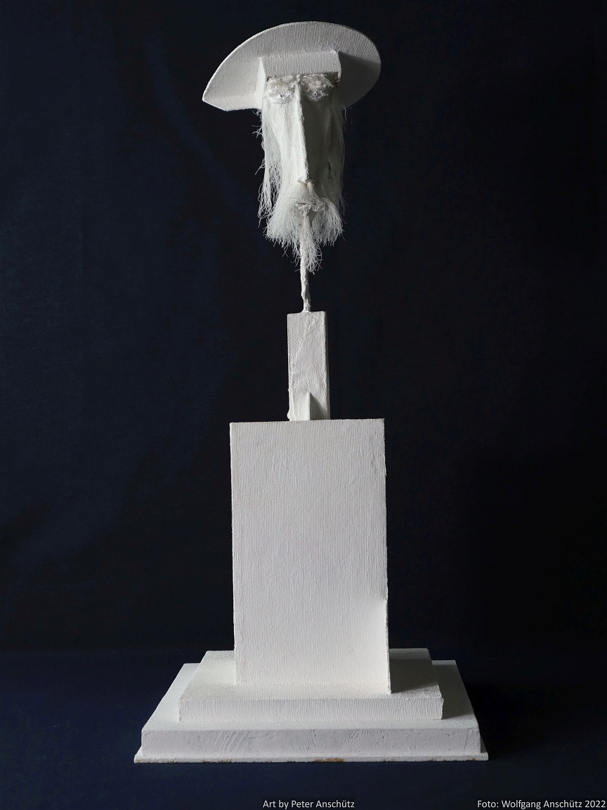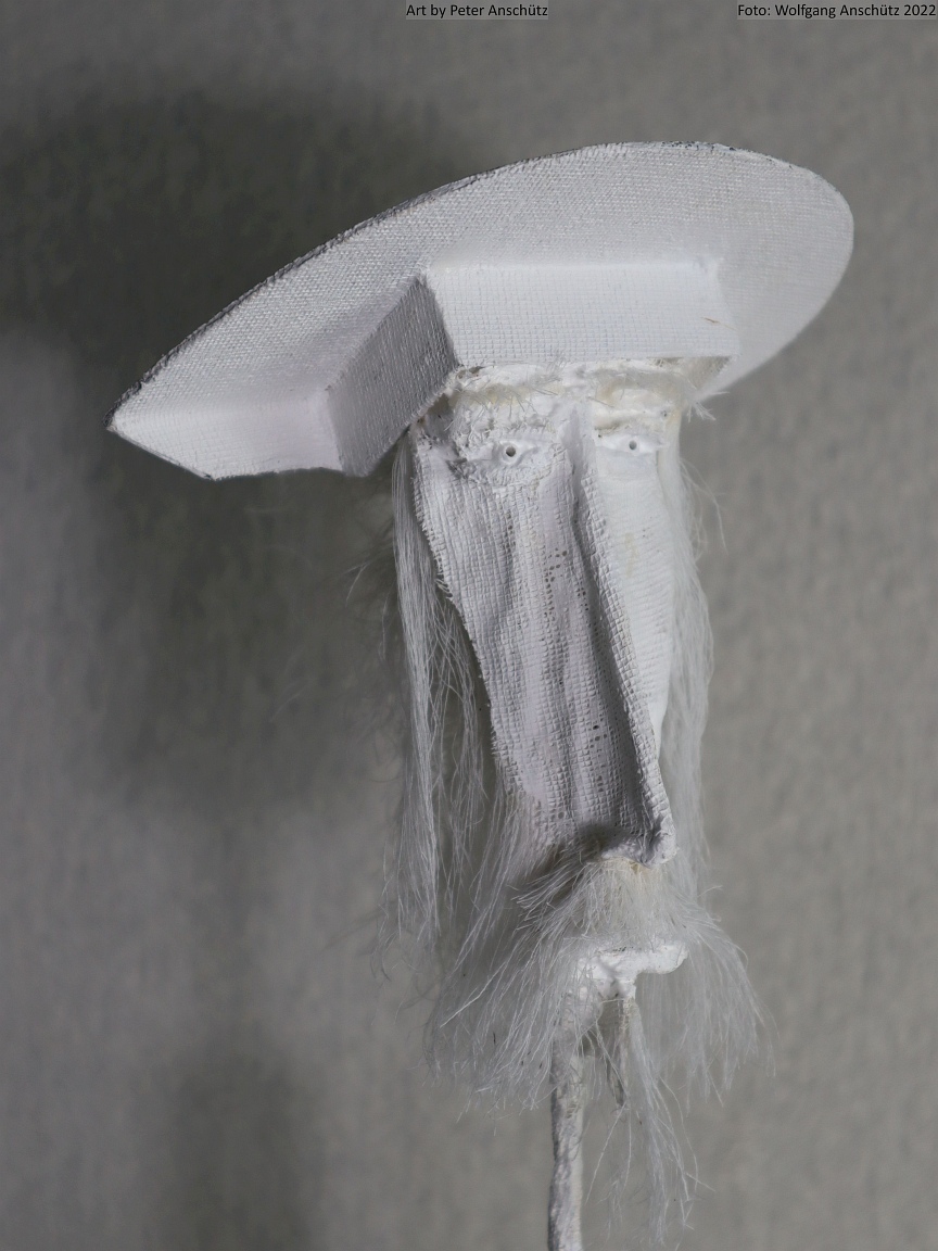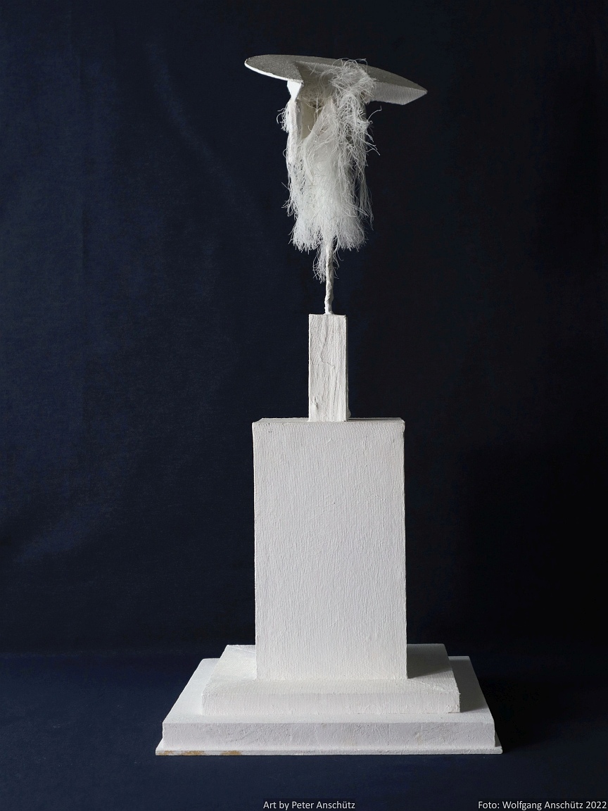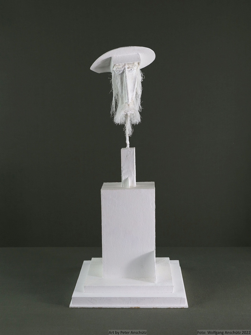 Holz, Eisendraht, Gazegewebe mit Acrylfarbe versteift